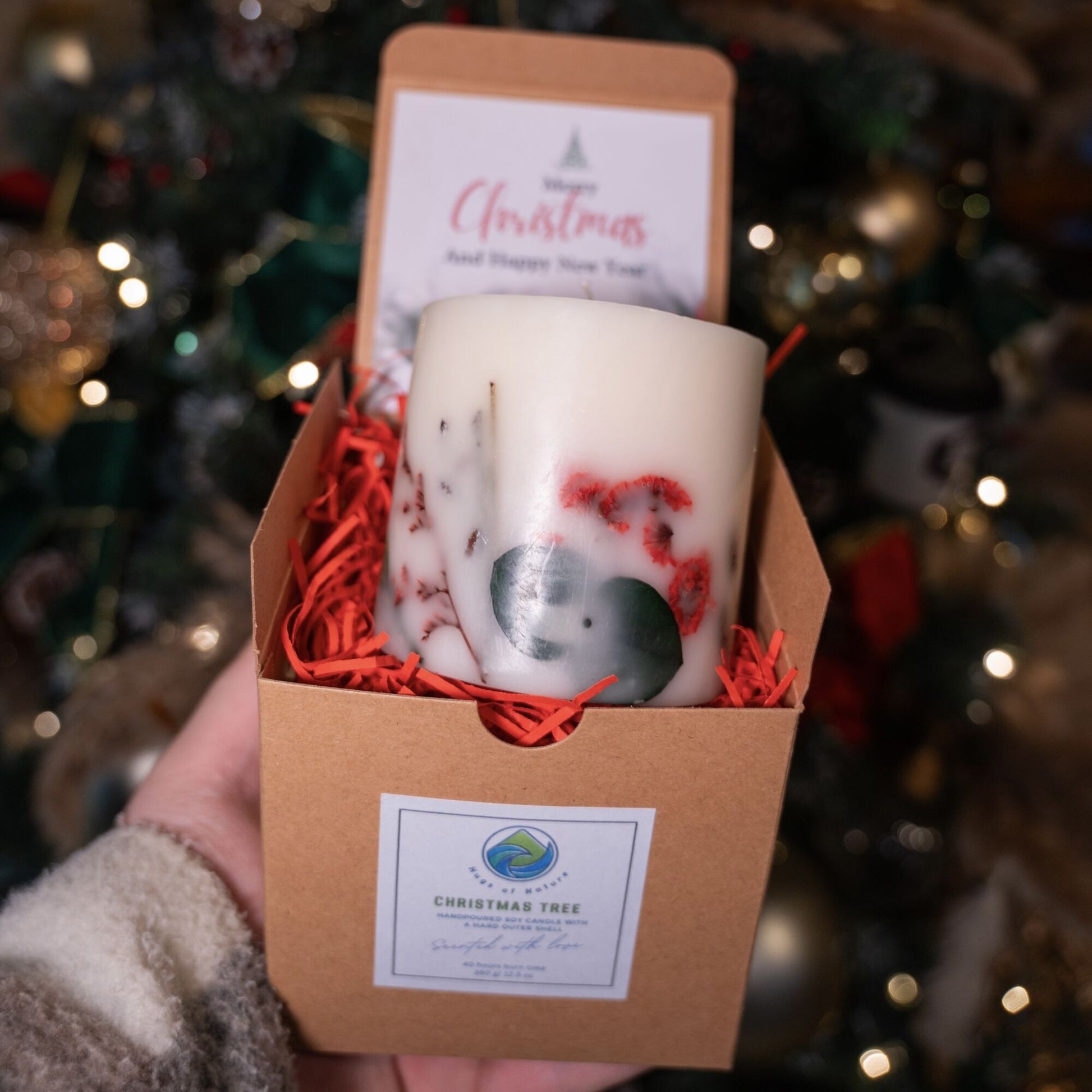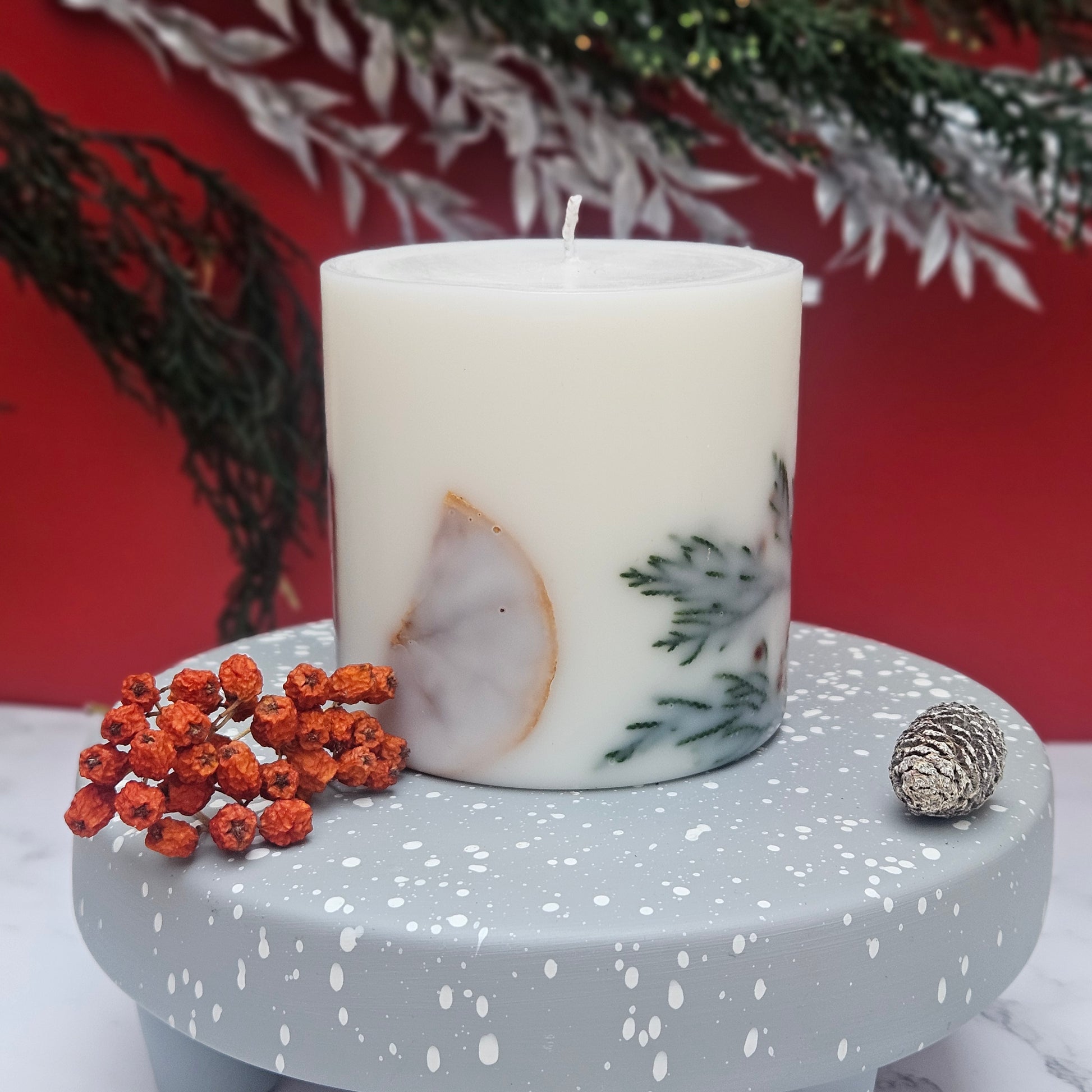 Our botanical candles feature a clean-burning soy wax core cradled within a decorative, harder wax vessel infused with natural elements. Our generously scented candles are designed to truly bring the essence of Christmas into your house. The botanicals are carefully selected to immerse you into a fairytale of a woodland Christmas, where magic happens.